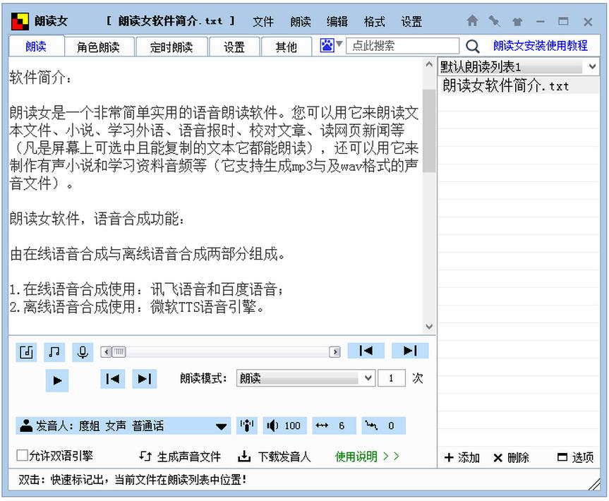 贰、使用语音软件语音朗读软件,是帮助我们学习的工具。同其它工具一样,使用的次数愈多,就愈熟练,效果也就愈显著,而且愈能用在点子上。如果你对软件的安装调试不太熟悉,可请熟悉的朋友帮忙,你只管使用。本工具有两种模式:网页朗读模式和视频观看模式。 语音朗读软件颇多,例如,“朗读女”就是一款简单好用的语音朗读软件。现将使用“朗读女”来朗读网页和以视频模式来观看的方法,介绍如下: 一、下载安装朗读女此软件可以在“朗读女”的官方网站下载。其网址是:http://www.443w.com/tts/ 下载后,进行解压、安装。运行时,“朗读女”的界面如下图所示: