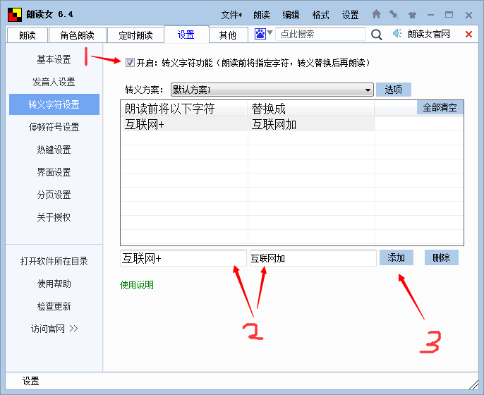 五、自定义发音对于某些词或词组,如果发音人的读音不令人满意,可以使用“转义字符”功能来设置发音。例如“互联网+”,一般发音人会读成 “互联网”,而“+”是不会读的。你自己可以进入“设置”项的“转义字符”页来设置,使其读成“互联网加”(如下图所示): 1、鼠标单击,选取“开启:转义字符功能”。 2、在下面“添加”、“删除”一行,输入所要设置的发音:互联网+ 互联网加。 3、鼠标单击“添加”。 4、返回“朗读”界面。